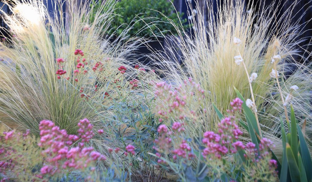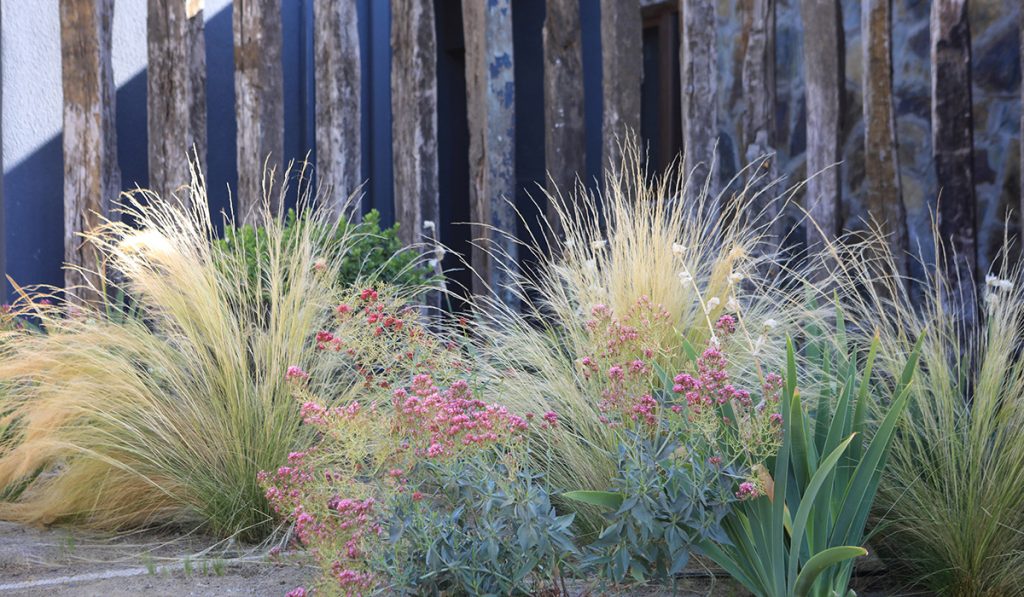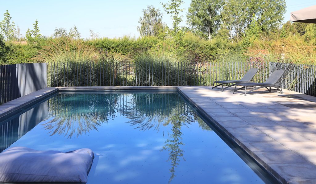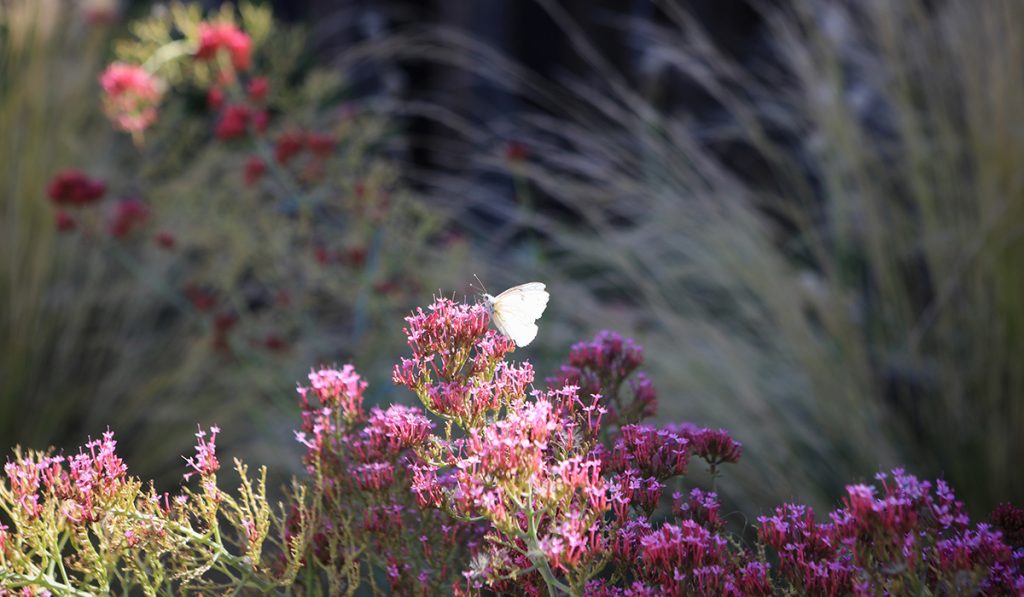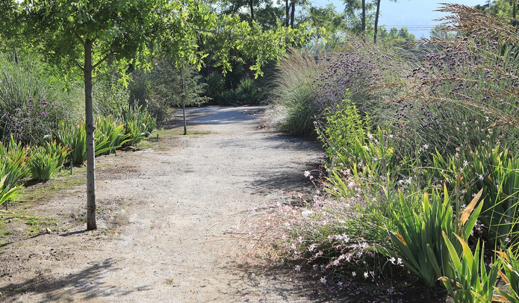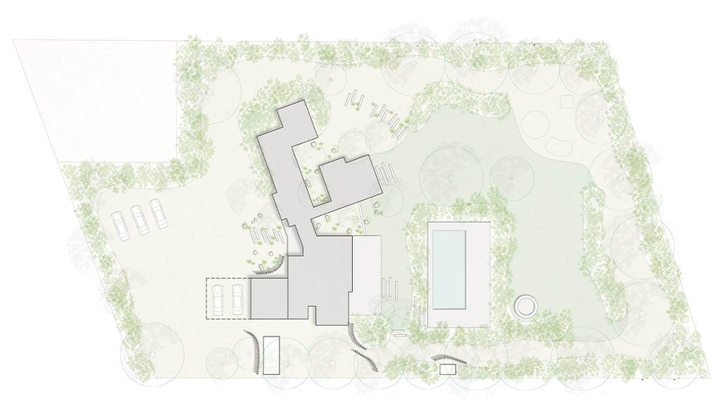 El jardín está compuesto por un amplio recorrido perimetral, el cual se va ensanchando para darle cabida a diferentes programas. La circulación va acompañada de macizos que van cambiando su color a lo largo de las estaciones del año, con pastos, lirios y múltiples herbáceas. En el centro se conserva parte del pasto existente y la piscina.
